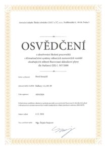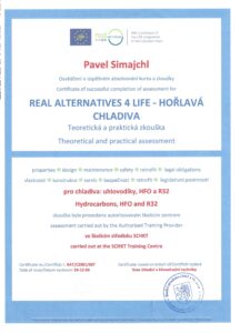 Pavel Simajchl je držitelem platného certifikátu odborné způsobilosti pro práci s klimatizačními a chladícími zařízeními dle evropského nařízení (EU) 2015/2067.